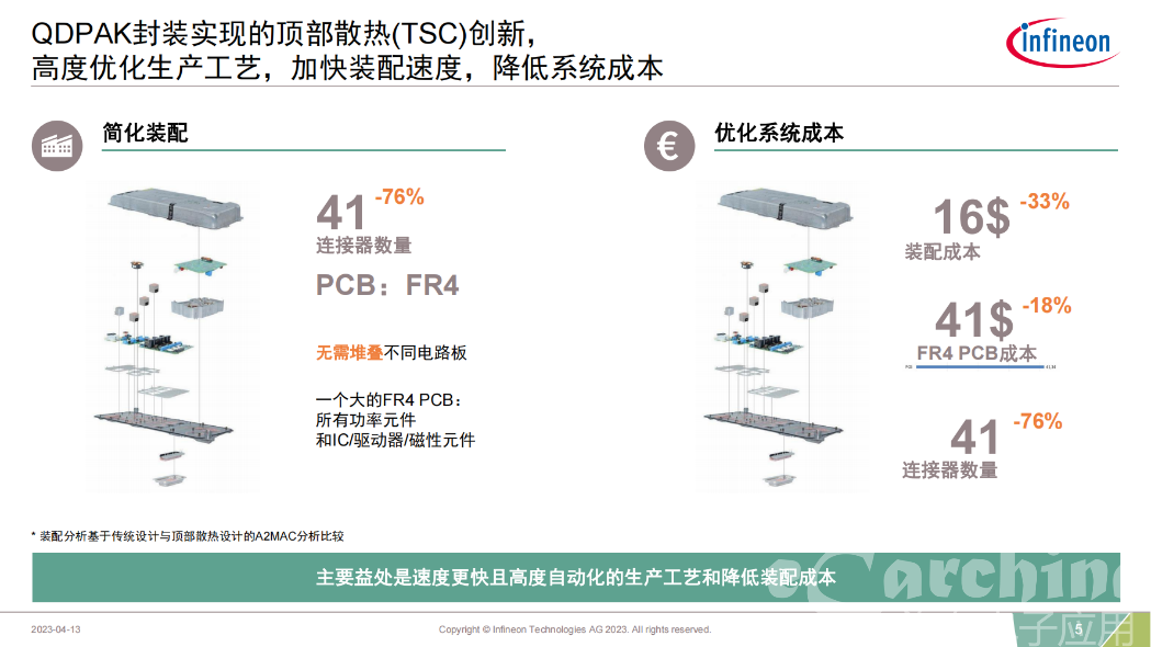 英飞凌适用于 高压(HV) 与低压( LV )器件的 QDPAK 和 DDPAK表面贴装 (SMD )TSC 封装采用 2.3 mm标准高度,可让开发人员使用所有相同高度的 SMD TSC 器件来设计完整应用,例如 OBC 和 DC-DC 转换。相较于必须使用 3D 冷却系统的现有解决方案,此封装不只对设计更有利,还可降低冷却系统成本。散热效能提升后,就不必再堆叠各种不同的板子。这些功能最终可降低整体系统成本。除了提升散热和功率能力,TSC 技术也提供更佳的电源回路设计,因为驱动器配置可以非常靠近电源开关,所以更加稳定。驱动器开关回路的低杂散电感则可降低回路寄生效应,因此栅极振荡较少、效能较高、故障风险较小。