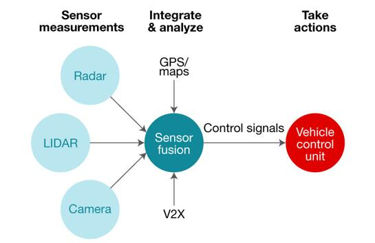 自动驾驶汽车使用多项传感器技术,包括摄像头、雷达和激光雷达。根据不同的环境条件和距离,这些传感器各有优缺点。传感器融合箱会分析这些传感器信号以及来自GPS和车联网系统的数据,用于创建精确的三维环境测绘图并发送适当的动作信号。图2是此类自主系统的方框图。