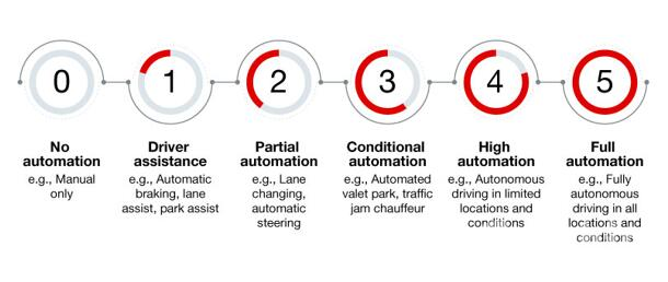在完全自主的自动驾驶汽车驶上公共道路之前,它必须经历六个不同的自动化等级,即从0级(无自动化)到5级(完全自动化),如图1所示。自动化等级每提升一级,都需要对高级驾驶辅助系统 (ADAS) 技术进行大幅改进,并实现对所有安全关键型功能的适当管理。