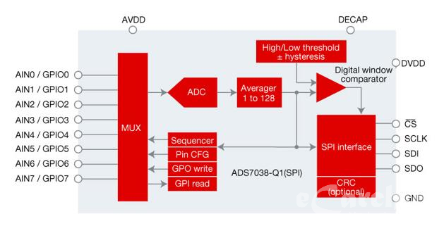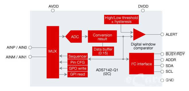 为促进实现这种诊断监控功能,德州仪器 (TI) 开发了ADS7038-Q1和ADS7142-Q1。ADS7038-Q1是一款超小型(3mmx 3mm)、8通道、12位、符合汽车电子委员会 (AEC)-Q100 1级标准的ADC,具有集成的通用输入输出引脚(GPIO)、可编程故障检测比较器、模拟看门狗和针对数据读取/写入操作和上电配置的8位循环冗余校验码。ADS7142-Q1是一款超小型(2mmx3mm)、双通道、12位、符合AEC-Q100 1级标准的ADC,具有可编程故障检测比较器。图4显示了ADS7038-Q1的方框图,图5显示了ADS7142-Q1的方框图。