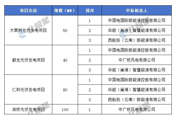 从竞配情况来看,中电国际新能源控股有限公司获得三个光伏项目的第一中标候选人,规模合计170MW;中广核风电有限公司获得其中一个光伏项目的第一中标候选人,规模为100MW。