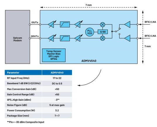 图5.高度集成的Ka频段下变频器,I/Q接口直接通向卫星通信调制解调器