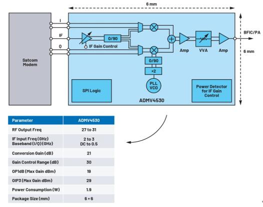 针对更高频率的Ka频段,ADI开发了ADMV4530/ADMV4540 UDC(图4和图5),它们支持需要I/Q基带接口的卫星通信调制解调器。 请注意,ADMV4530上变频器是双模器件,它还能支持IF接口。这些解决方案采用硅工艺设计,集成度非常高,可应对大批量终端应用中常见的集成压力。