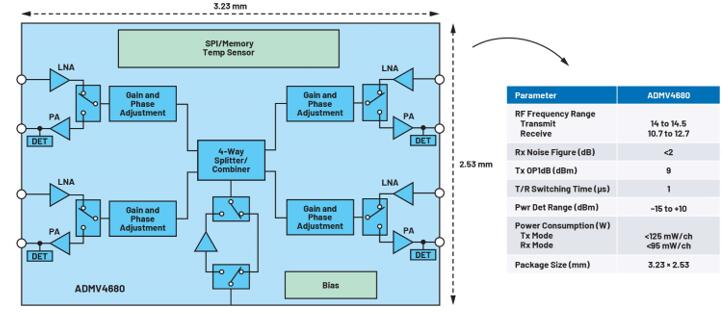 为了应对这一挑战,ADI开发了Ku频段波束成形集成电路(BFIC)技术。ADMV4680是一款针对用户终端设计的硅解决方案,允许通过半双工通道独立控制信号的增益和相位。令人惊异的是,该IC的尺寸只有8.2 mm2,如图7所示。
