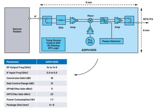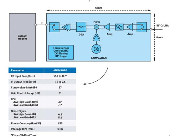 ADI开发了一系列针对用户终端的Ku和Ka频段UDC,以解决尺寸、重量、面积、功耗和成本(SWaP-C)问题。这些UDC包含众多RF和IF信号调理功能,例如滤波器、放大器、衰减器、PLLVCO和功率检测。所有IC的设计都考虑到了用户终端的信号链性能。ADMV4630/ADMV4640是Ku频段UDC,支持卫星调制解调器的IF接口,如图2和图3所示,表中显示了IC性能的亮点。