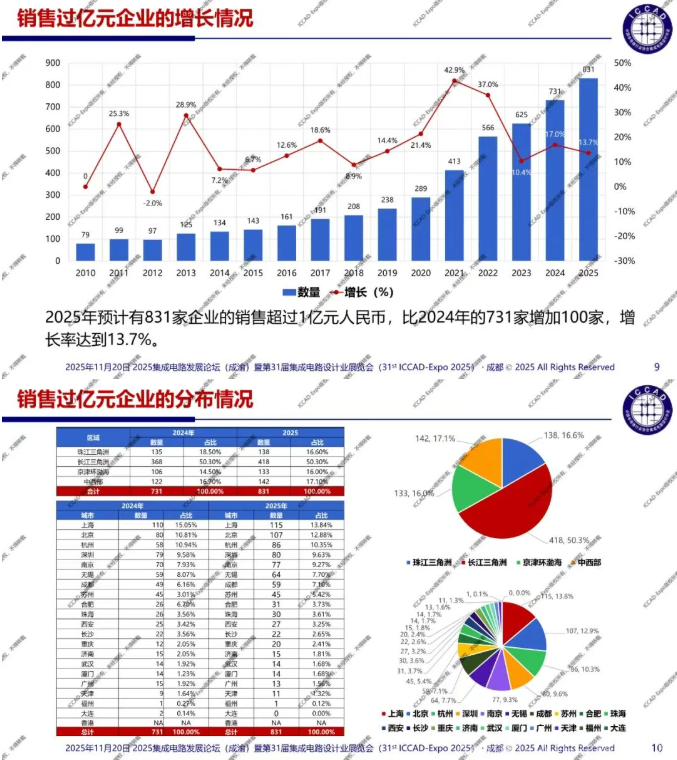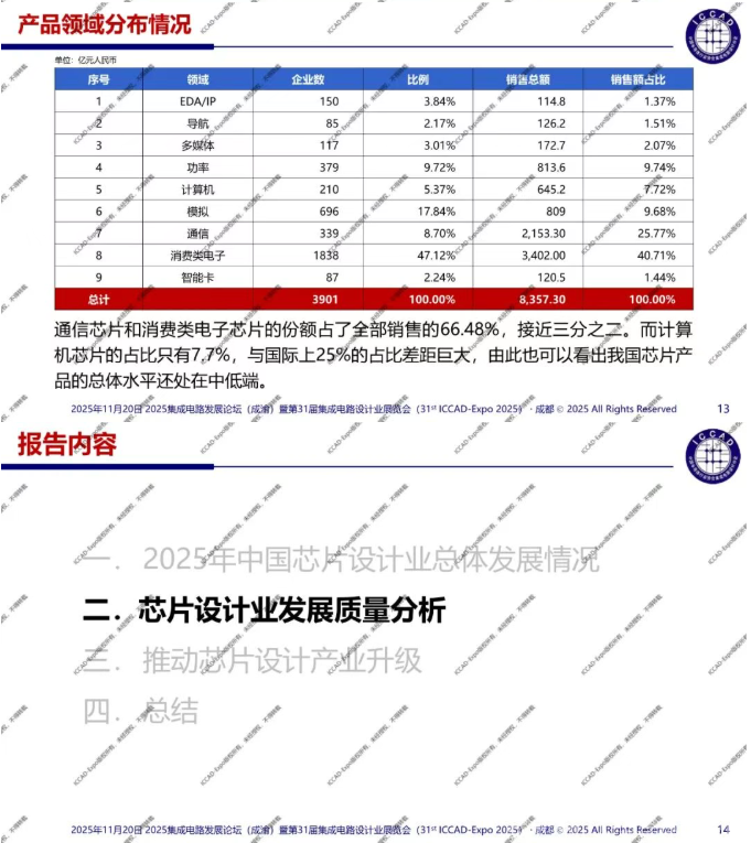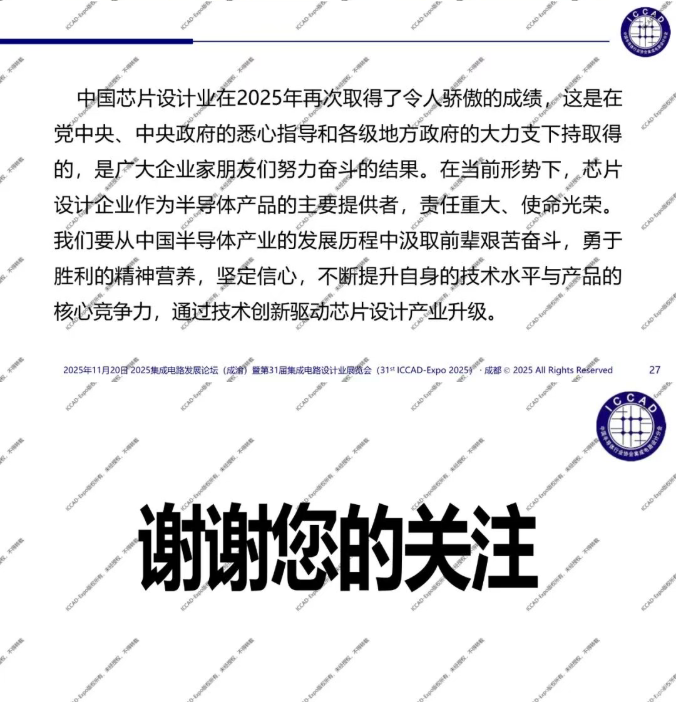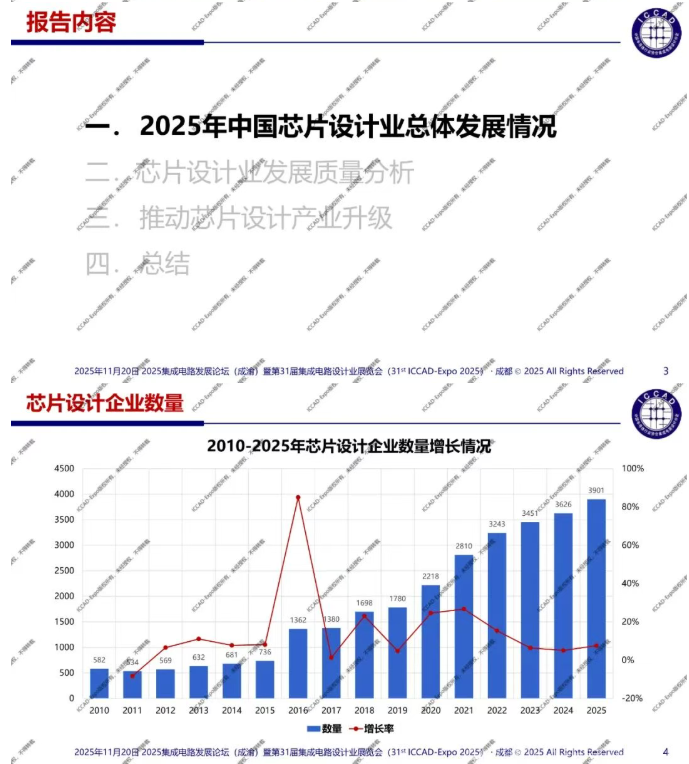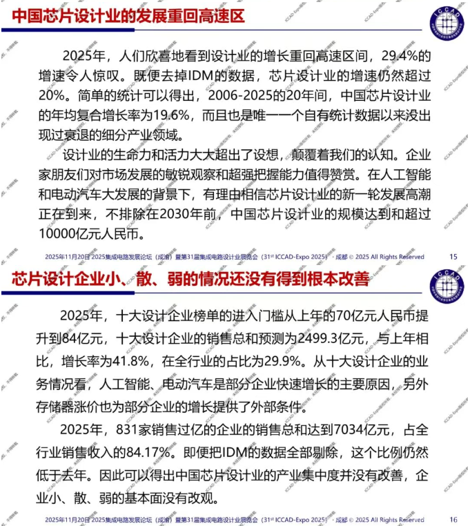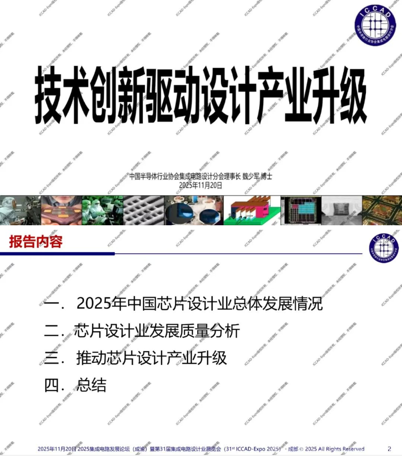 第31届中国集成电路设计行业年会(ICCAD-Expo 2025)今天在成都西博城拉开帷幕,大会以“开放创芯,成就未来”为主题。中国半导体行业协会集成电路设计分会理事长魏少军教授在高峰论坛环节作了“技术创新驱动设计产业升级”主旨报告,介绍了2025年中国芯片设计业总体发展情况,对芯片设计业发展质量进行了分析。