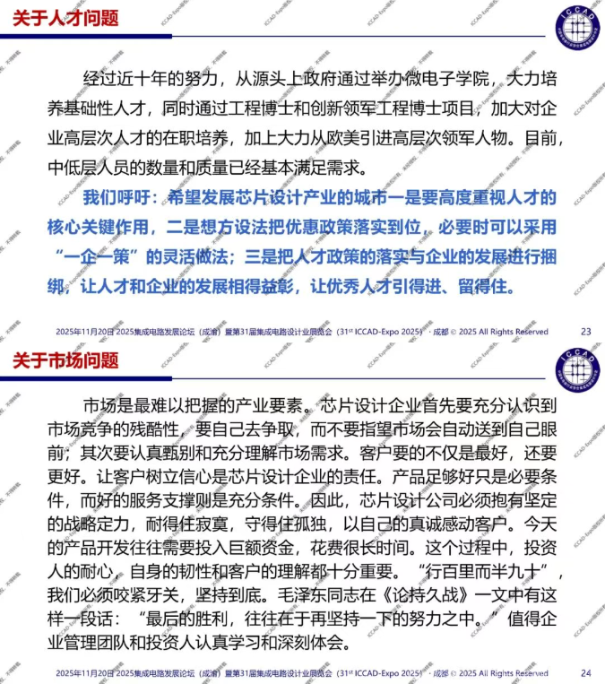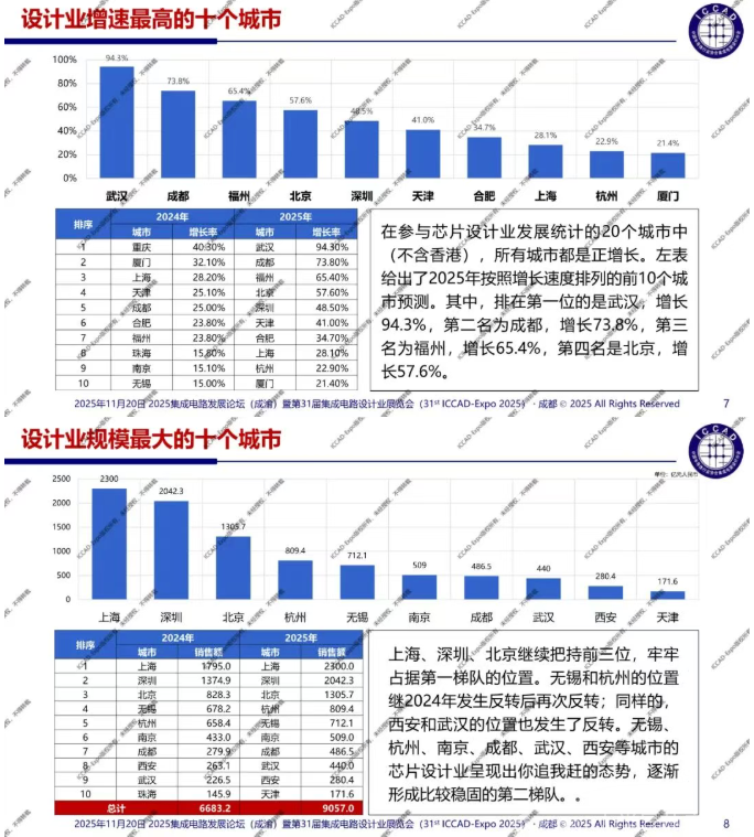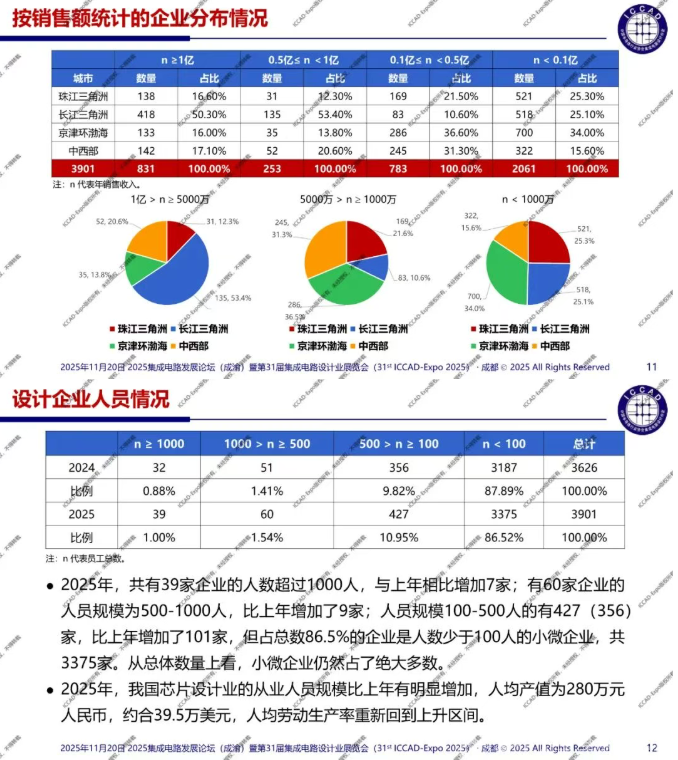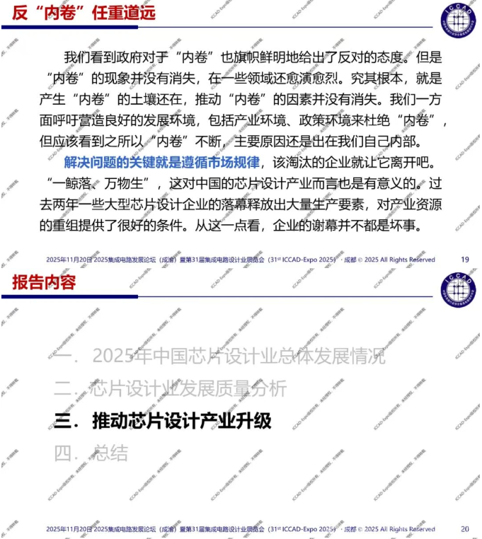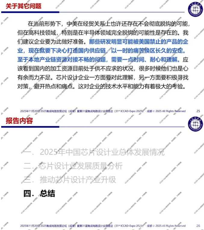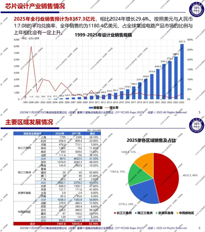 第31届中国集成电路设计行业年会(ICCAD-Expo 2025)今天在成都西博城拉开帷幕,大会以“开放创芯,成就未来”为主题。中国半导体行业协会集成电路设计分会理事长魏少军教授在高峰论坛环节作了“技术创新驱动设计产业升级”主旨报告,介绍了2025年中国芯片设计业总体发展情况,对芯片设计业发展质量进行了分析。