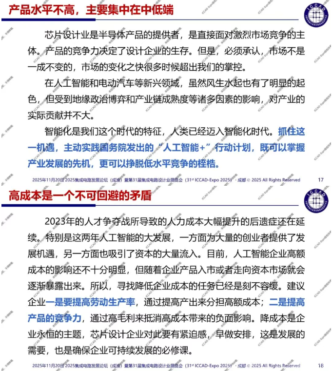 魏教授指出,2025年芯片设计全行业销售预计为8357.3亿元,相比2024年增长29.4%。智能化是我们这个时代的特征,人类已经迈入智能化时代。抓住这一机遇,主动实践国务院发出的“人工智能+” 行动计划,既可以掌握产业发展的先机,更可以挣脱低水平竞争的桎梏。