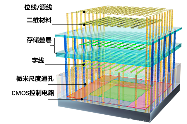 二维-硅基混合架构闪存芯片结构示意图,包含二维模块、CMOS控制电路和微米尺度通孔