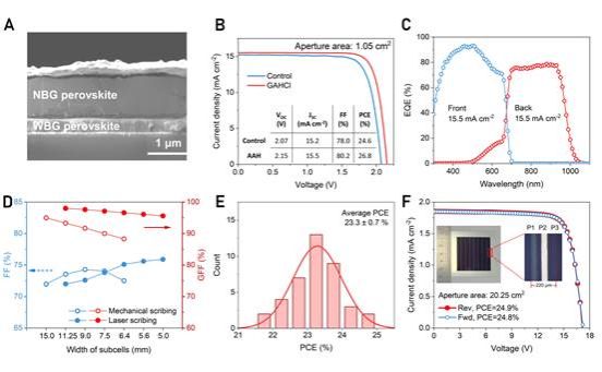 图3. 全钙钛矿叠层太阳能组件的光伏性能。(A)全钙钛矿叠层器件的截面电子显微镜照片;(B-C)小面积全钙钛矿叠层电池的光电转换效率;(D-F)全钙钛矿叠层光伏组件的性能。