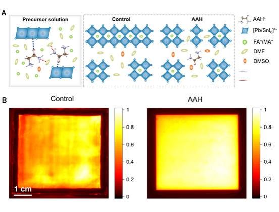 图1. 大面积窄带隙钙钛矿薄膜的均匀制备。(A)甘氨酰胺盐酸盐与钙钛矿的相互作用示意图;(B)甘氨酰胺盐酸盐对钙钛矿薄膜均匀性的提升。