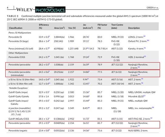 图4. 最新太阳能电池世界纪录效率表(叠层电池部分)。《Solar cell efficiency tables》是由"太阳能之父"Martin Green教授与美、日、意、澳等多国科学家联合编撰的国际权威榜单,代表了全球光伏领域的最前沿水平。