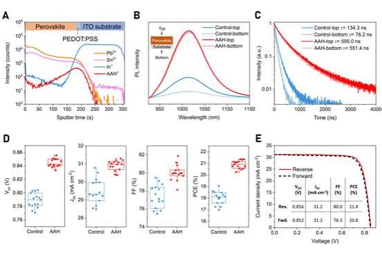 进一步,甘氨酰胺盐酸盐在前驱体溶液中的高溶解度可以诱导其自发聚集在钙钛矿薄膜的底部界面处,减少底部界面处的缺陷密度,大幅提升钙钛矿薄膜的载流子寿命,将可量产技术制备的铅锡窄带隙单结钙钛矿电池的光电转换效率从18.9%提升至21.4%(如图2所示),这是目前报道涂布技术制备的最高效率,为高效率全钙钛矿叠层组件的制备奠定了技术基础。
