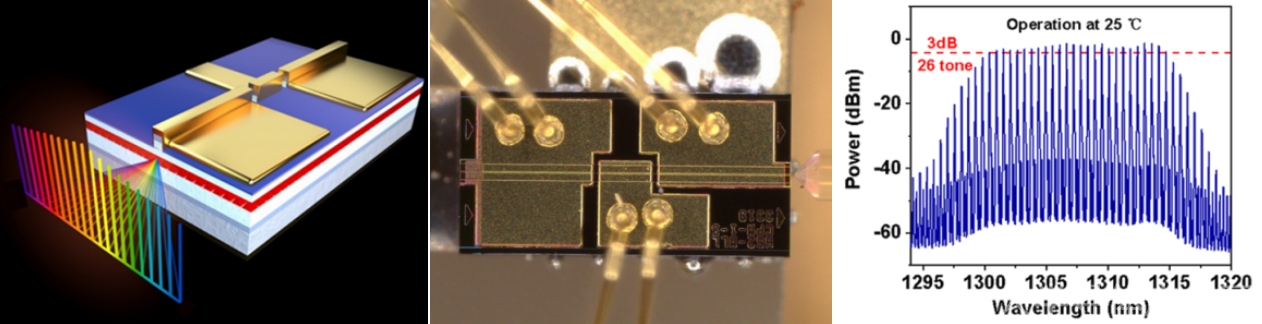 (左)锁模光频梳示意图;(中)光频梳器件结构图;(右)室温下26个通道的光谱图