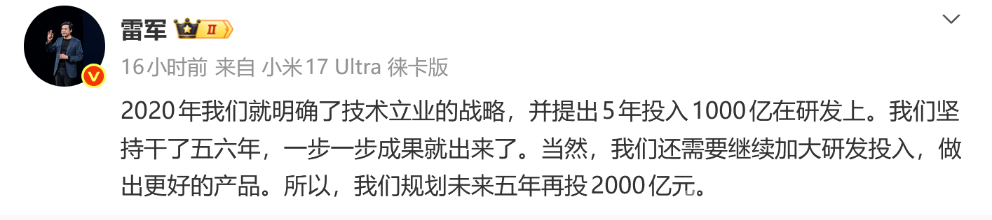 1月8日晚间,小米创办人、董事长兼CEO雷军在个人社交平台上发文称:“2020年我们就明确了技术立业的战略,并提出5年投入1000亿在研发上。我们坚持干了五六年,一步一步成果就出来了。当然,我们还需要继续加大研发投入,做出更好的产品。所以,我们规划未来五年再投2000亿元。”