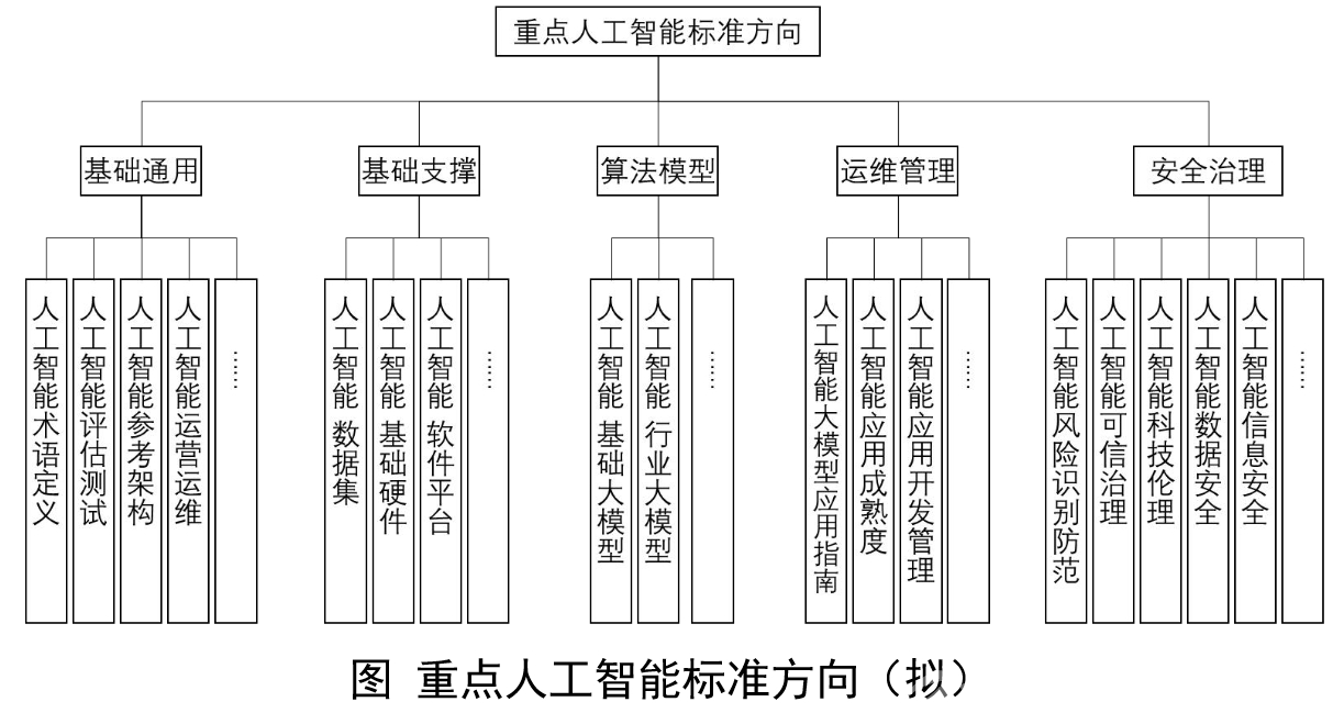 重点人工智能标准方向主要包括基础通用、基础支撑、算法模型、运维管理、安全治理等,如图所示。