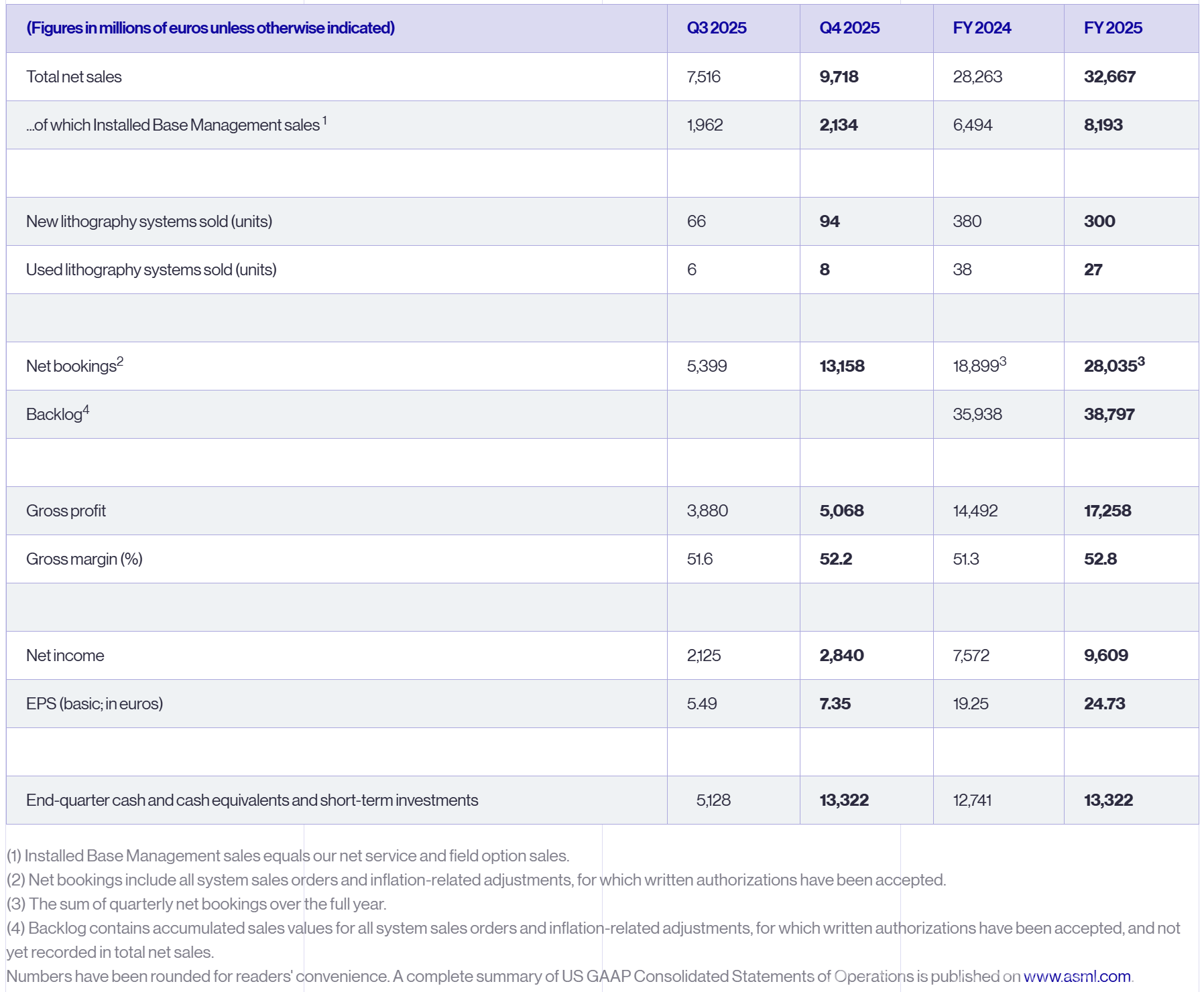阿斯麦(ASML)在 2025 年再次创下佳绩,全年净销售额达 327 亿欧元,毛利率为 52.8%。第四季度表现尤为强劲:我们报告的净销售额创纪录,达 97 亿欧元,其中包括两套高数值孔径系统所确认的收入。我们第四季度的毛利率与预期相符,为 52.2%。