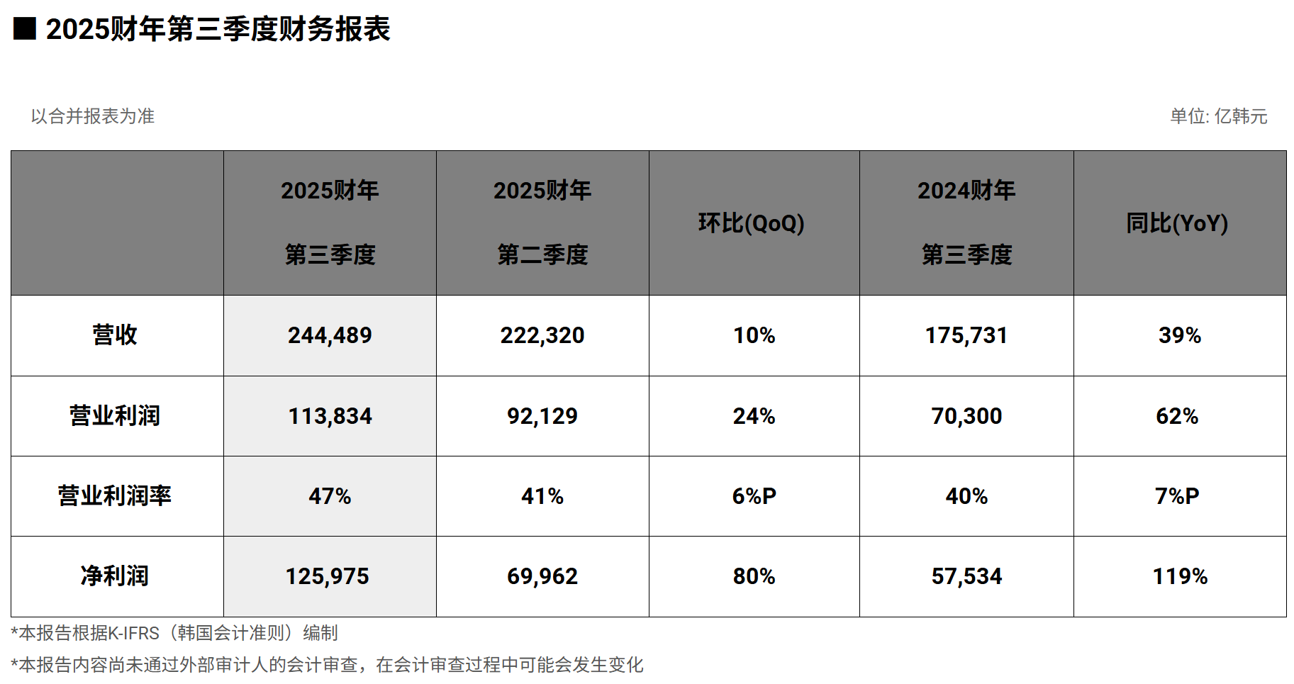 2025年10月29日,SK海力士今日发布截至2025年9月30日的2025财年第三季度财务报告。公司2025财年第三季度营业收入为24.4489万亿韩元,营业利润为11.3834万亿韩元,净利润为12.5975万亿韩元。2025财年第三季度营业利润率为47%,净利润率为52%。(K-IFRS为准)
