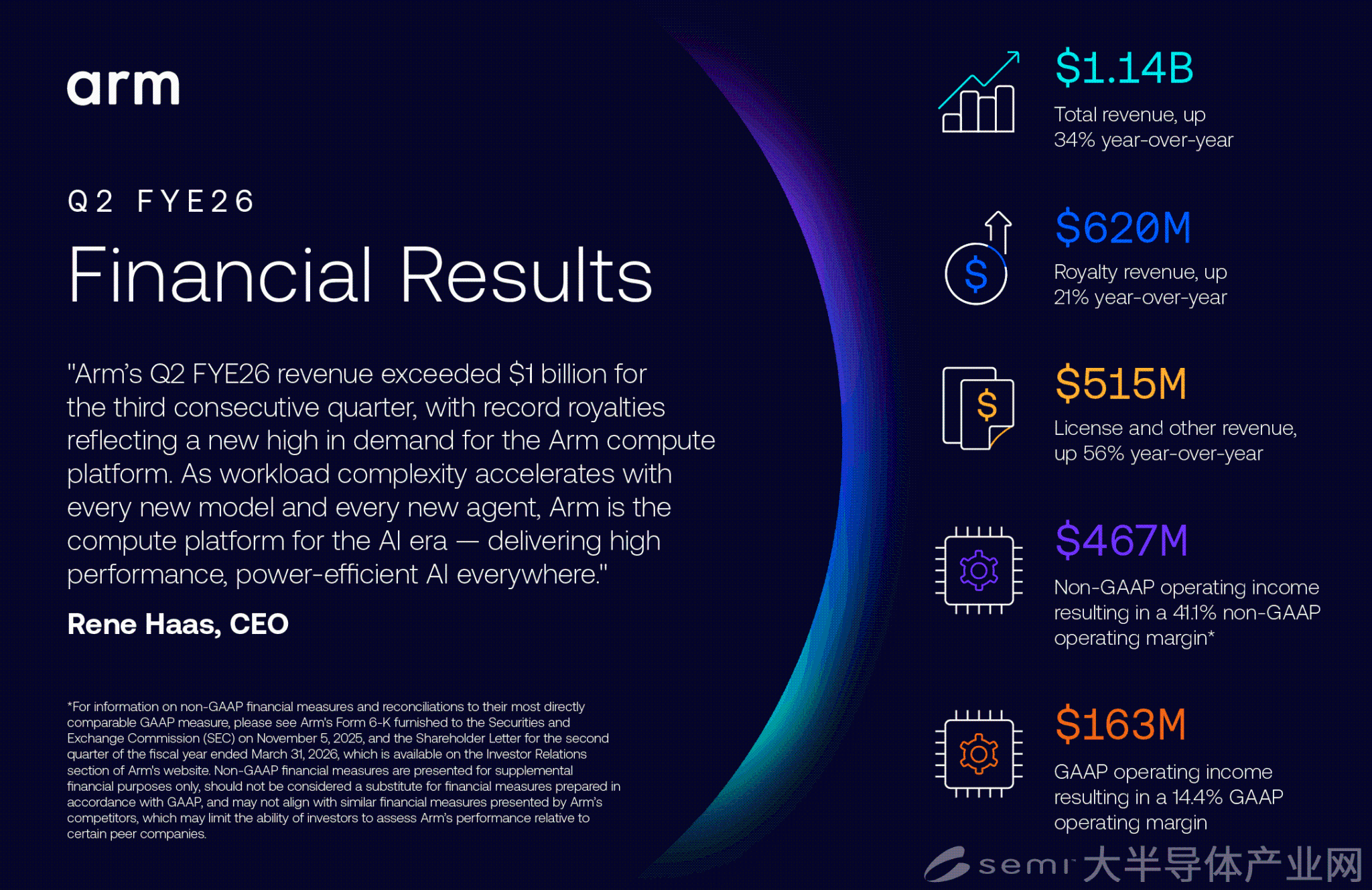 2025年11月5日,Arm向股东发布了一封信函,其中包含截至 2025年9月30日的2026财年第二季度业绩。以下信息图表提供了关键要点。
