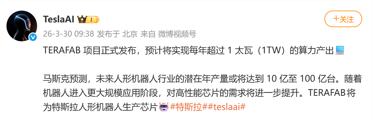 3月30日,TeslaAI官方微博宣布,正式启动TERAFAB超级芯片工厂项目,预计将实现每年超过1太瓦(1TW)的算力产出,这相当于当前全球AI芯片年总算力产出的约50倍。马斯克表示,这将是迄今为止历史上最宏大的芯片制造项目。