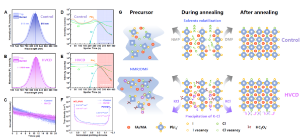 针对传统生长方法导致钙钛矿中氯元素分布不均的问题,团队提出了垂直方向均匀化氯元素分布的策略(HVCD):通过在钙钛矿薄膜生长中引入碱金属草酸盐,利用解离出的钾离子与氯离子之间的强结合作用,有效束缚氯元素的垂直无序迁移,使其在钙钛矿材料中均匀分布。