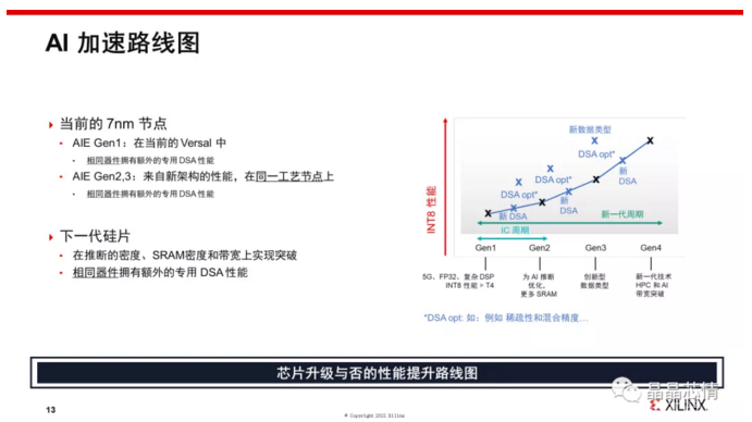 在此次交流会上,赛灵思公布的AI 加速路线图显示,现在最新一代AIE是7nm的工艺节点,主要为无线和航空航天 DSP 处理而引入,其MLPERF 超越了T4。