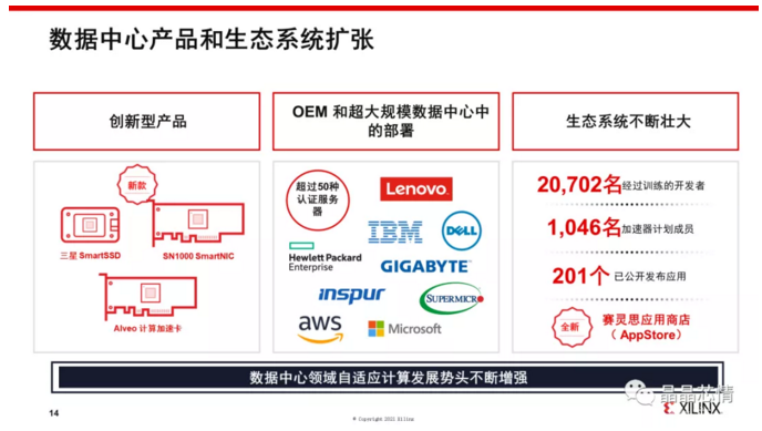 赛灵思也加入了数据中心应用的生态系统当中,有超过两万多名经过训练的开发者,一千多名加速器计划的成员,还有两百多个已经公开发布的应用,在不久之前还推出了全新的赛灵思应用商店,使得客户可以在这里更高效地使用、购买、开发基于赛灵思的应用。