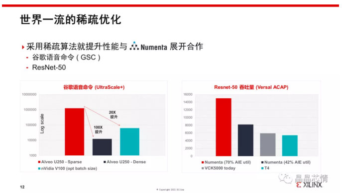 Victor认为,先进工艺是一方面,另外通过稀疏优化也能够提升性能。下图左边这张可以看到如何利用神经网络的稀疏度的优化来实现更好的性能,以Alveo 250来看,它在稀疏和高密度的情况下,性能都是非常不同的,和CPU相比,也会有大的优势。