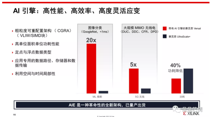 在7nm Versal的架构下赛灵思推出了AI引擎,它是粗粒度可重配置的架构,CGRA,VLIW和SIMD块,能够实现非常高的单位面积与单位功耗性能。已经和Versal器件一起出货。