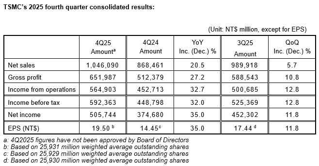 2026年1月15日——台积电今日公布截至2025年12月31日的第四季度合并营收为新台币10460.9亿元,净利润为新台币5057.4亿元,摊薄每股收益为新台币19.50元(每美国存托凭证单位3.14美元)。