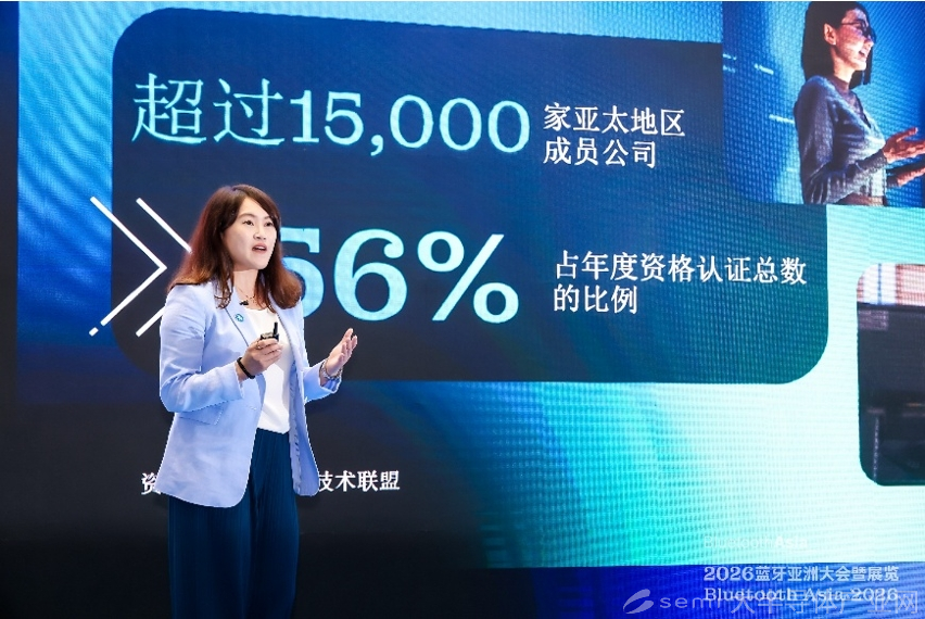 蓝牙技术联盟亚太暨中国资深总监李佳蓉(Lori Lee)在2026蓝牙亚洲大会暨展览上发表主题演讲