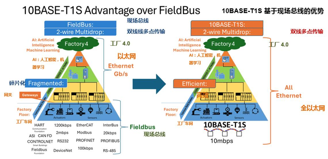 随着 10BASE-T1S 的出现,工业网络得以简化,同时性能也得到了提高。不再需要网关的存在,边缘连接也从低于 1Mb/s 的现场总线协议转变为10Mb/s 的确定性以太网。