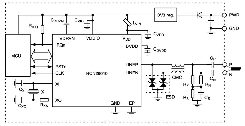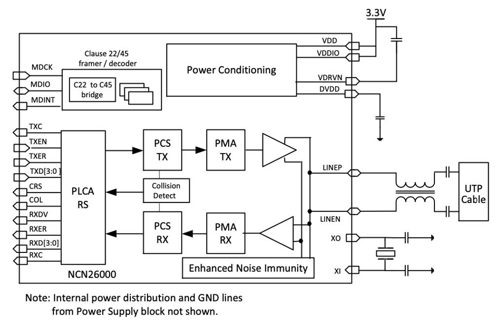 这两款器件的主要区别在于,NCN26000 在一个 5mm x 5mm QFN 封装中仅包含 PLCA-RS 和 PHY(TX + RX)。NCN26000 还需要 3.3 V 电源和 25MHz 外部时钟。