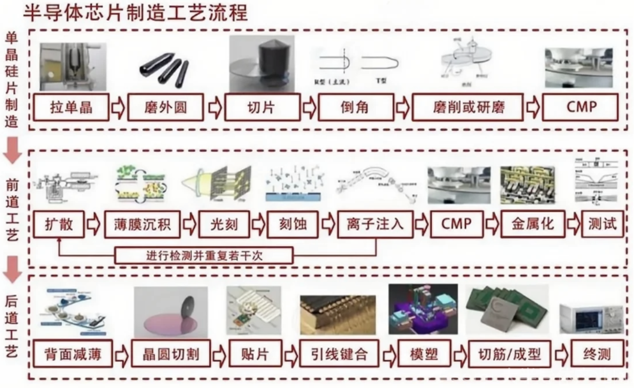 ·前道制造工艺:经过薄膜沉积,光刻,刻蚀,离子注入,研磨,金属化等工艺形成一个个晶体管。