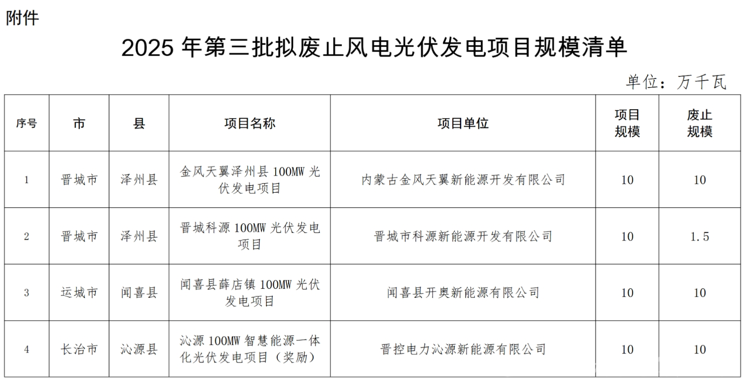 11月7日,山西省能源局公示了《2025年第三批拟废止风电光伏发电规模清单》,共8个项目45.732万千瓦光伏、风电项目被废止。