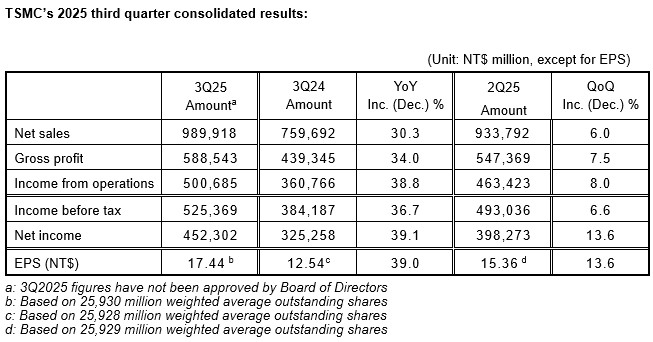 2025年10月16日,台积电公布截至2025年9月30日的第三季度合并营收为新台币9,899.2亿元,净利润为新台币4,523亿元,每股摊薄收益为新台币17.44元(每美国存托凭证单位2.92美元)。