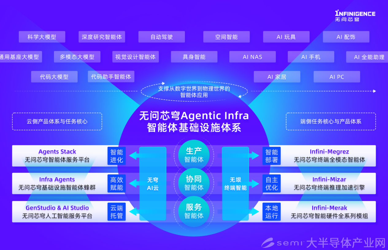 以智能体为代表的人工智能技术正逐步从数字世界走向物理世界,在各种生产劳动场景中,借助云端基础设施、移动终端设备与具身机器人等载体影响现实。作为国际领先的人工智能基础设施企业,秉持“生产智能体、协同智能体、服务智能体”理念,无问芯穹进一步构建了完整的“智能体基础设施 ×(AI 云 + 终端智能)”技术与产品架构,支撑数字世界与物理世界的智能体应用效能突破与持续进化。