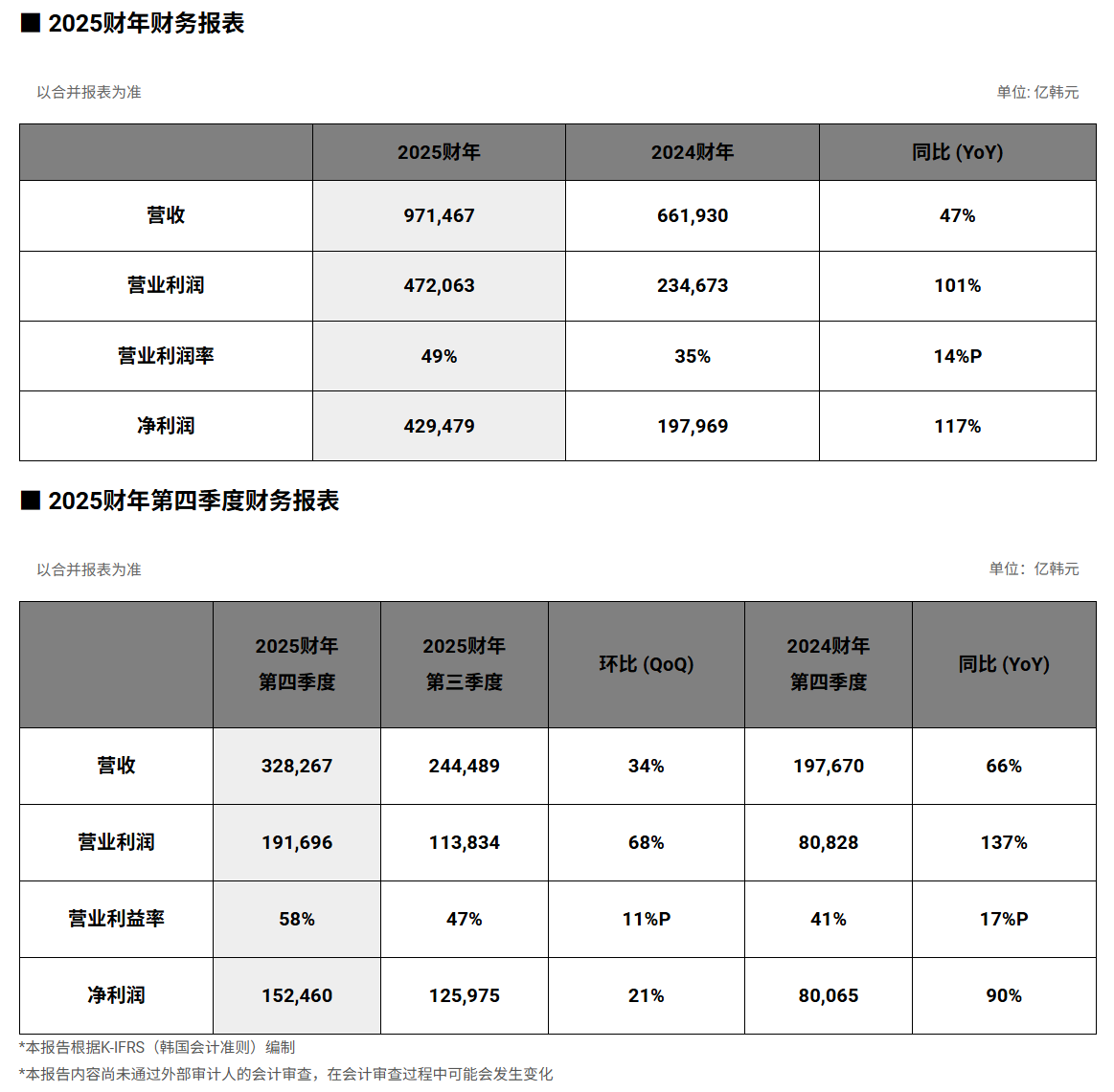 – 2025财年全年营收为97.1467万亿韩元,营业利润为47.2063万亿韩元,净利润为42.9479万亿韩元